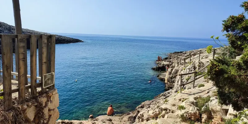 Flat rocks around the bay provide comfortable places for sunbathing, while ladders make entering the water easy and safe. A traditional seaside tavern above the bay offers food and drinks with beautiful views of the coastline.