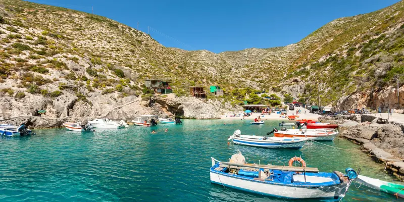 Porto Vromi is a small scenic bay surrounded by steep cliffs and crystal-clear water. It is one of the main departure points for boat tours to Navagio Beach.